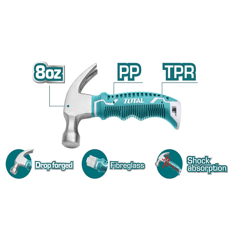 چکش میخ کش دسته کوتاه توتال مدل THTM7386D محصول شرکت توتال TOTAL می باشد. این محصول 220 گرمی ساخته شده از فولاد ریخته گری با روکش ضدزنگ است که به روش آهنگری ساخته شده است و سطح آن برای استقامت بالاتر و کاربری بهینه، سخت کاری شده است. اتصال دسته به وزنهی این چکش با کمک چسب اپوکسی و به صورت کاملا مستحکم انجام شده است. دستهی فایبر گلاس 12 سانتیمتری این چکش دوشاخ دسته کوتاه، از PP با دستگیرهی پلاستیک TPR کنگرهدار ساخته شده که مستهلککنندهی ضربه است و طراحی ارگونومیک و سازگار با دست دارد. چکش میخ کش دسته کوتاه توتال دارای مقاومت بالا در مقابل ضربه های سخت است و با طراحی و تولید با کیفیت و مناسب، در امور مختلف عمومی و تخصصی صنعتی برای ضربه زنی ، میخ کشی، ساخت و مونتاژ و تعمیرات، به کار شما خواهد آمد. این چکش میخ کش خوش دست، 220 گرم وزن و طولی برابر با 12 سانتیمتر دارد. و در ابعاد برابر با 3×10.5×12سانتیمتر است.برای امور نجاری و سایر فعالیتها و مشاغل خود می توانید روی این چکش میخ کش دسته کوتاه حساب باز کنید.