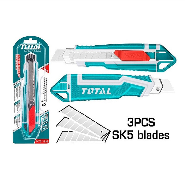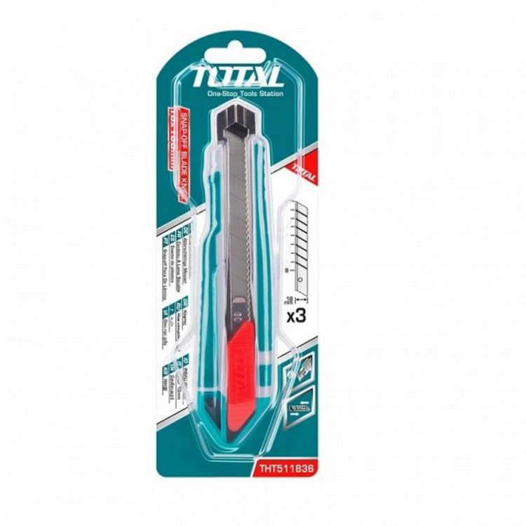 کاتر 3 تيغ دسته پلاستيکی توتال مدل THT511836 محصول شرکت توتال total می باشد. این کاتر خوش دست بوده و دارای بدنه پلاستیکی است. و دارای ضامن قفل قوی است کاتر 3 تیغه j,jhg دارای بدنهی مقاوم پلاستیکی ارگونومیک است که روکش پلاستیک TPR آجداری دارد که در هنگام کار، در دست عرق نمیکند و سر نمیخورد.تیغه کاتر توتال از جنس فولاد SK5 می باشد که یکی از آنها بر روی کاتر سوار است و دوتای دیگر در داخل بدنهی کاتر تعبیه شده اند. این تیغه ها در اندازهی استاندارد 18×100 میلیمتراند و به صورت 8 تکه ساخته شده اند تا بعد از کند شدن، آنها را شکست و به قسمت تیز رسید. شرکت سازنده این کاتر برند توتال است که محصولات خود را در چین و تحت لیسانس فرانسه تولید می کند و کیوسک ابزار محصولات این برند را عرضه می نمایید.