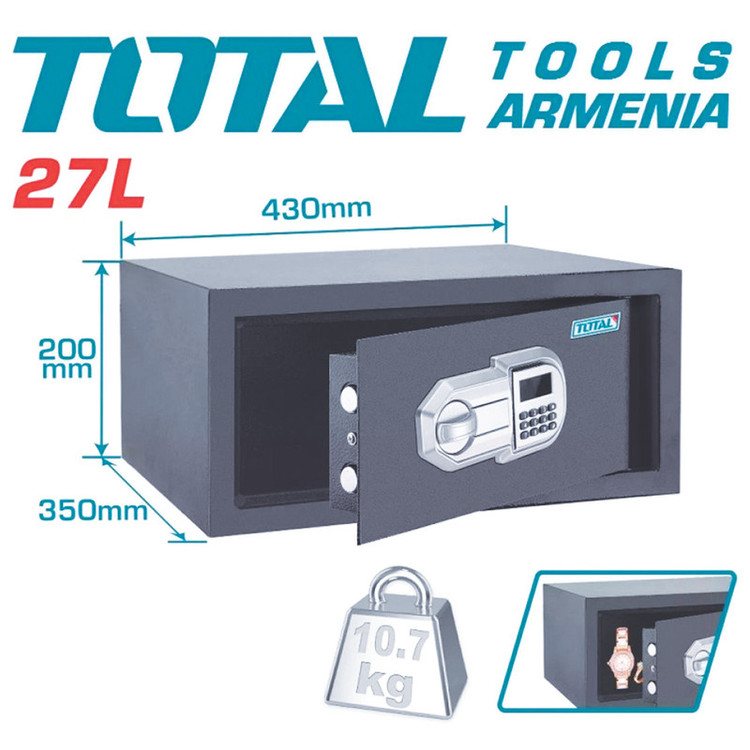گاوصندوق 27 لیتری الکترونیک توتال مدل TESF3501 یک گاوصندوق الکترونیکی است که توسط برند جهانی توتال تولید شده است . برند توتال یک کمپانی جهانی میباشد که با استفاده از تکنولوژی های روز دنیا و رعایت استانداردهای صنعتی روز دنیا محصولات خود را تحت لیسانس آمریکا در کشور چین تولید کرده و به تمامی کشور های جهان از جمله کشور های اروپایی صادر میکند که به این واسطه دارای استاندارد CE اروپا نیز میباشد . گاوصندوق الکترونیکی توتال مدل TESF3501 تحت برسی کارشناسان فنی ابزار باطن قرار گرفته است و اگر بخواهیم نتیجه این برسی را با شما به اشتراک بگذاریم باید در ابتدا به کیفیت بالا طراحی ، ضخامت درب 4.2 میلیمتری ، امکان ثبت کد ۳ تا ۸ رقمی که باعث امنیت بالای این محصول شده است اشاره کنیم که همچنین میتوان گاوصندوق 27 لیتری الکترونیک توتال مدل TESF3501 را روی دیوار یا زمین استفاده کرد این گاوصندوق علاوه بر الکترونیکی بودن قابلیت استفاده با کلید را نیز دارد . اقلام همراه گاوصندوق 27 لیتری الکترونیک توتال کد TESF3501 شامل : 2 عدد کلید مکانیکی و 1 عدد دفترچه راهنما است . بررسی بیشتر این محصول میتوانید به ابزار باطن مراجعه کنید .