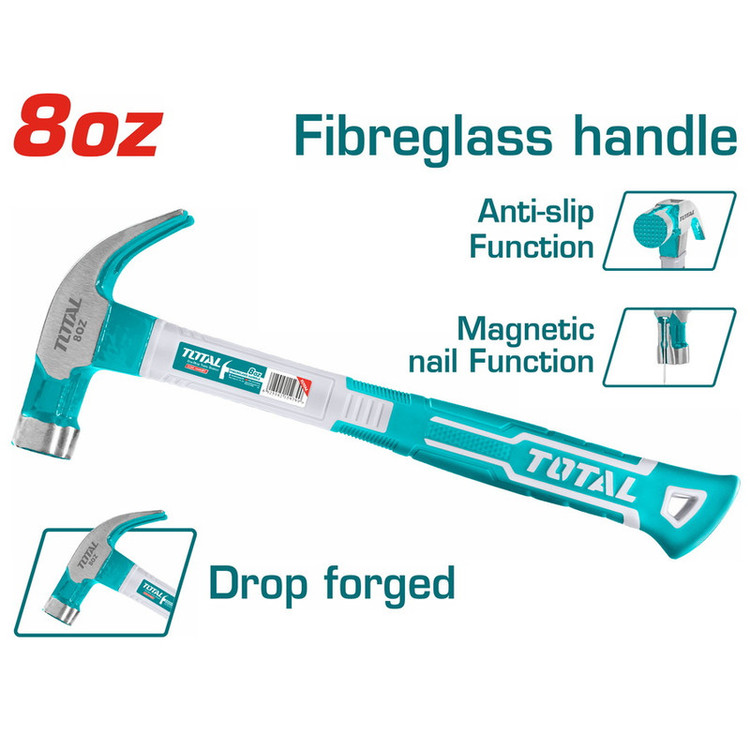 برند توتال در ساخت چکش مدل THTCH0086 از آلیاژ فولاد حرارت دیده بسیار مقاوم استفاده کرده که به روش فورج بر روی آن سخت کاری و پرداخت شده تا کارایی بهتر و دوام بالایی در برابر زنگ زدگی، فشار، خوردگی و ضربه داشته باشد. این ابزار با وجود وارد کردن ضربات شدید و پی درپی بر روی میخ یا هر چیز فلزی بدون آسیب و خم شدن سر چکش کاربری بسیار عالی را در اختیار کاربر قرار می دهد. دسته این وسیله از روکش پلاستیکی فایبرگلاس ضد لغزش باکیفیتی برخوردار می باشد که با وزن کم و عدم تعریق دست سرعت عمل را افزایش داده و بر روی انجام آسان تر کار با ایمنی بیشتر تاثیر خواهد گذاشت. این چکش به صورت دو شاخ چنگکی ساخته شده که برای بیرون کشیدن میخ های بزرگ و جدا کردن برخی اجسام مناسب است. این چکش با کیفیت توسط مجموعه کیوسک ابزار عرضه می گردد