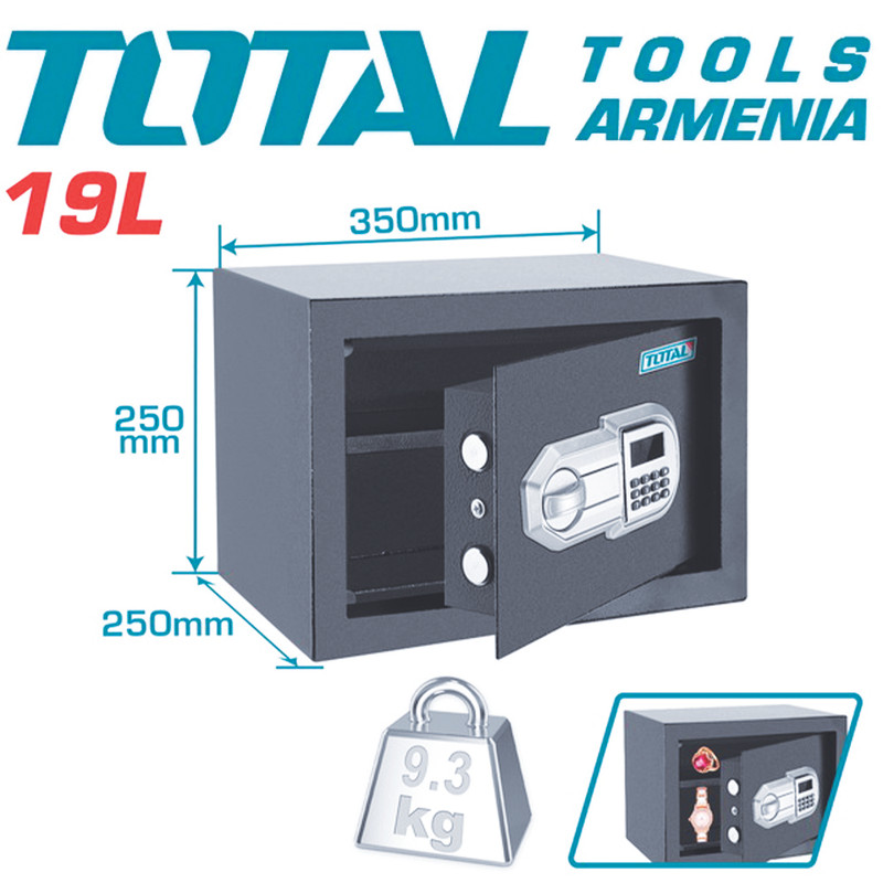گاوصندوق 19 لیتری الکترونیک توتال مدل TESF2501 یک گاوصندوق الکترونیکی است که توسط برند جهانی توتال تولید شده است . برند توتال یک کمپانی جهانی میباشد که با استفاده از تکنولوژی های روز دنیا و رعایت استانداردهای صنعتی روز دنیا محصولات خود را تحت لیسانس آمریکا در کشور چین تولید کرده و به تمامی کشور های جهان از جمله کشور های اروپایی صادر میکند که به این واسطه دارای استاندارد CE اروپا نیز میباشد . گاوصندوق الکترونیکی توتال مدل TESF2501 تحت برسی کارشناسان فنی ابزار باطن قرار گرفته است و اگر بخواهیم نتیجه این برسی را با شما به اشتراک بگذاریم باید در ابتدا به کیفیت بالا طراحی ، ضخامت درب 4.2 میلیمتری ، امکان ثبت کد ۳ تا ۸ رقمی که باعث امنیت بالای این محصول شده است اشاره کنیم که همچنین میتوان گاوصندوق 19 لیتری الکترونیک توتال مدل TESF2501 را روی دیوار یا زمین استفاده کرد این گاوصندوق علاوه بر الکترونیکی بودن قابلیت استفاده با کلید را نیز دارد . اقلام همراه گاوصندوق 19 لیتری الکترونیک توتال کد TESF2501 شامل : 2 عدد کلید مکانیکی و 1 عدد دفترچه راهنما است . بررسی بیشتر این محصول میتوانید به ابزار باطن مراجعه کنید .
