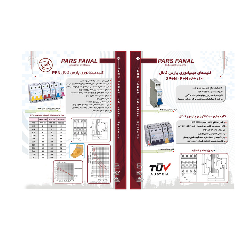 کلید مینیاتوری (MCB ) وسیله ای حفاظتی است که از تجهیزات الکتریکی و صنعتی در برابر آسیب های ناشی از اضافه بار و یا اتصال کوتاه محافظت می نماید.کلید های مینیاتوری جریان متناوب پارس فانال در سه تیپ روشنایی (B) ، موتوری (C) و سخت موتوری (D) در انواع تک پل ، تک پل با نول (1P+N) ، دو پل ، سه پل ، سه پل با نول (3P+N) و چهار پل تولید می شوند. این محصول کلید مینیاتوری سه پل 2 آمپر تیپ C با ظرفیت قطع 6KA می باشد.