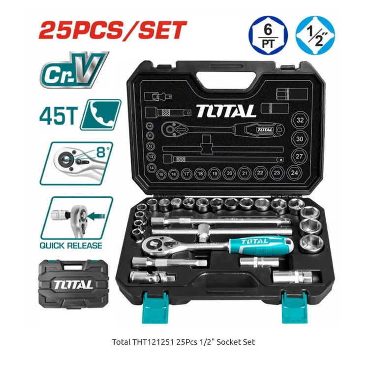 جعبه بکس توتال مدل THT121251 یک ست بکس ۲۵ پارچه ۱/۲ اینچ محصول شرکت توتال است. شرکت «توتال» نمونههای مختلفی از مجموعههای بکس را تولید کرده است. یکی از این تولیدات، مجموعه بکس ۲۵ پارچه مدل THT121251 است که ابعاد جعبه این بسیار مناسب است و فضای بسیار کمی را در منزل، صندوقعقب خودرو یا کارگاه و محل کار شما را اشغال میکند. محتوای این مجموعه شامل 25 عدد سری بکس با استاندارد متریک و تعدادی لوازم و آچارهای دیگر میشود. آلیاژ مرغوبی برای ساخت این مجموعه بهکاررفته است. این مدل با برند توتال به بازار معرفی شد. توتال محصولات مختلف، متعدد و متنوعی درزمینهی ابزار تولید و عرضه کرده است. جعبه بکس توتال مدل THT121251 ، شامل ۲۵ قطعه میشود که 18 عدد از آنها سری بکس با درایوهای ۱/۲ اینچ هستند. . جنس دسته و سریها تماما از کروم-وانادیوم بوده که باعث عدم واکنش آنها با رطوبت و مقاومت در برابر خوردگی خواهد شد.